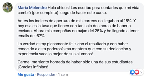 «Lo que nos resulto muy llamativo a la comunidad de afiliados fueron los maravillosos emails de Carme, que los estábamos esperando con deleite; eran preciosos, muy interesantes y apetecía leerlos. Nos llamaron mucho la atención sus tasas de apertura, del 70%. Y, todos, como locos, quisimos aprender cómo lo hacía. Y nos pusimos a aprender con ella. Tanto Carme como su hermana fueron las dos afiliadas que tuvieron la tasa de conversión más grande de todo el lanzamiento.«